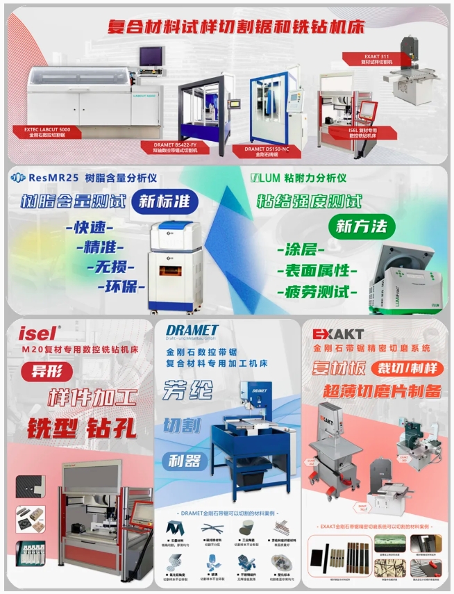 展會(huì)上我司展出了德國(guó)DRAMET數(shù)控切割鋸床、德國(guó)EXAKT311CL金剛石復(fù)材試樣切割機(jī)、德國(guó)ISEL M30銑鉆數(shù)控機(jī)床、德國(guó)EXAKT三輥研磨機(jī)、LUMiFrac粘附力與粘結(jié)強(qiáng)度測(cè)試分析儀、紐邁ResMR25樹(shù)脂含量分析儀等儀器設(shè)備,吸引了眾多業(yè)內(nèi)人士前來(lái)觀摩和交流。