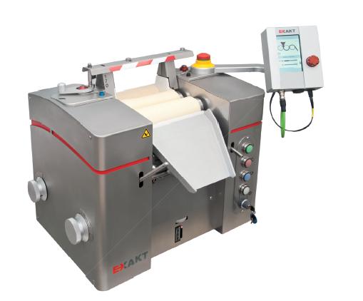 1.輥筒材質(zhì):鍍鉻不銹鋼、氧化鋁或碳化硅。2.可達120微米的細度(取決于物料本身的特性),以及次微米的特殊應(yīng)用。3.“單點控制間距調(diào)整”持續(xù)可調(diào)滾筒間距4.產(chǎn)量可達160 1hr。5.安全性過載保護,緊急停止,具備容易清洗,方便拆卸。 6.通用性從實驗室到生產(chǎn)。 產(chǎn)品描述 EXAKT 120S450是精巧的桌面型,適合更多高要求物料。其拉力系統(tǒng)確保滾筒間距恒定及粒徑大小的均等。變頻調(diào)速裝置用于不同黏度產(chǎn)品對不同速度要求的調(diào)節(jié)。所有滾筒及其材質(zhì)均可被加熱及冷卻。通用刮刀系統(tǒng)具備可調(diào)出口寬度的擋板和可調(diào)刮刀緊度,固定刮刀座更加有效確保出料結(jié)果。帶有手擋的不銹鋼進料斗和防滴漏托盤。產(chǎn)品質(zhì)量符合CE標(biāo)準