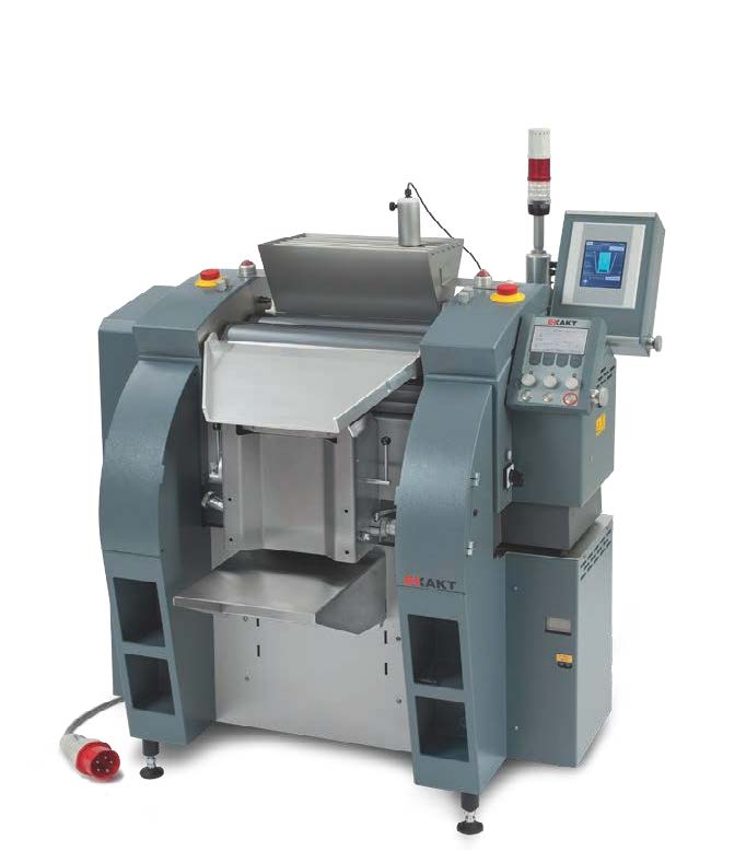 1.可達小于1微米的細度。2.間距和壓力模式可在屏幕進行調(diào)整。3.自動校準 自動調(diào)節(jié)輥的間距和平行。4.所有的操作參數(shù)可電子顯示及調(diào)整。5.數(shù)據(jù)紀錄提供參數(shù)記錄文件(需另購)6.在5μm的間距下,產(chǎn)量可達 27.5 Lhr7.使用過程中容易控制或保持滾筒的溫度變化。8.安全性過載保護,清洗和反轉(zhuǎn)模式。 9.通用性從實驗室到生產(chǎn)。 10.滾筒材質(zhì)可選擇鍍鉻不銹鋼、碳化鎢、氧化鋁或碳化硅。 產(chǎn)品描述 新型 EXAKT 80S PLUS 三滾機具有更高的安全標(biāo)準,更方便的操作,并且可以更精確地調(diào)整間距。更強力的馬達,可選擇的溫度監(jiān)測以及陶瓷或金屬滾筒材質(zhì),新型80S PLUS 適合用于加工各種不同的材料,適用范圍于實驗室中的少量至批量生產(chǎn)。在大范圍的操作條件和高規(guī)格的安全性下,確保了許多產(chǎn)品的理想使用條件。產(chǎn)品質(zhì)量符合CE標(biāo)準。