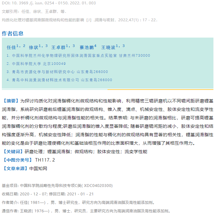 [15]XU N,WANG X B,MA R,et al. Insights into the rheological behaviors and tribological performances of lubricating grease: entangled structure of a fiber thickener and functional groups of a base oil[J].New Journal of Chemistry,2018 42( 2) : 1484-1491.