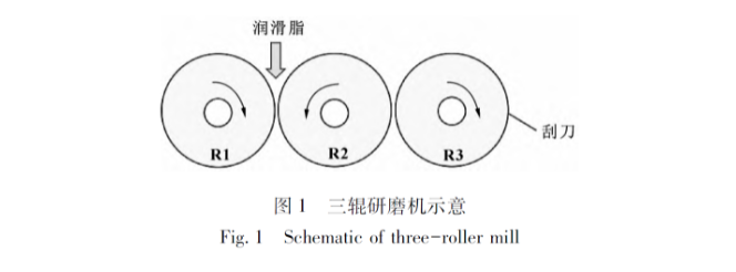 將上述制備的鋰基潤(rùn)滑脂樣品分為5份,其中4份采用輥間距可精確調(diào)整的三輥研磨機(jī) EXAKT 80E PLUS研磨處理。三輥研磨機(jī)示意圖見圖1。