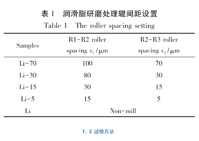 潤(rùn)滑脂研磨處理輥間距設(shè)置和對(duì)應(yīng)樣品名稱見表1,研磨輥間距的設(shè)置主要參考文獻(xiàn)[16-17],研磨輥R1、R2、R3 的轉(zhuǎn)速比設(shè)置為1∶3∶9,研磨輥R3的轉(zhuǎn)速為300r/min。