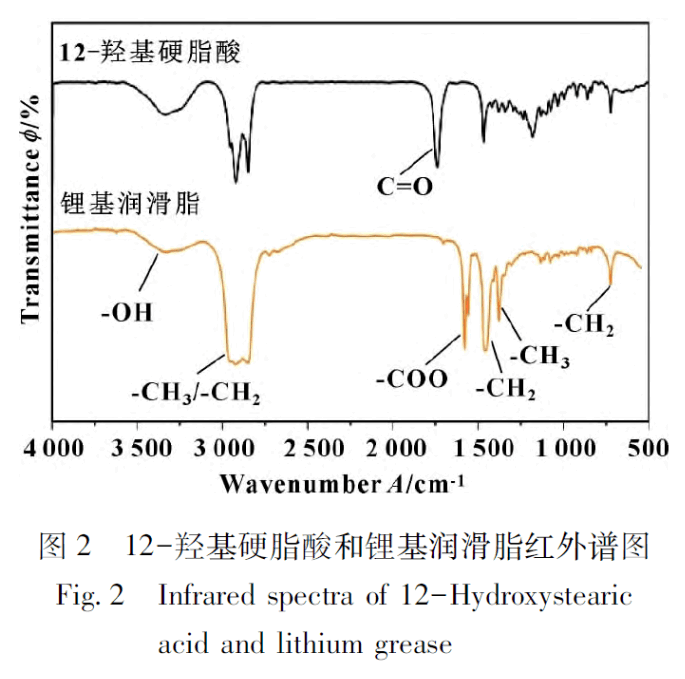 圖2 所示為12-羥基硬脂酸和制備的鋰基潤(rùn)滑脂的紅外譜圖。