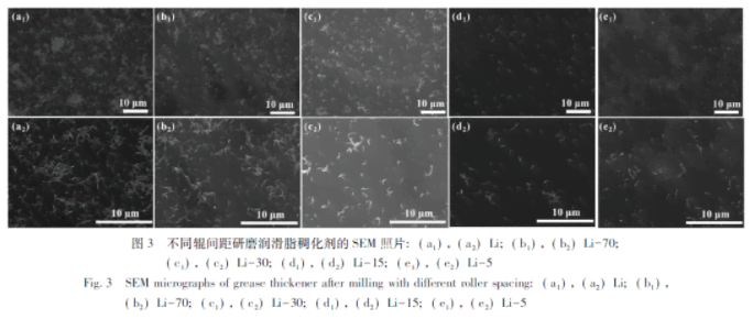 圖3 所示為采用不同輥間距研磨處理潤(rùn)滑脂稠化劑的微觀結(jié)構(gòu)照片??梢钥闯觯瑵?rùn)滑脂稠化劑為較短的纖維狀。對(duì)比未研磨處理的潤(rùn)滑脂Li 和不同輥間距研磨處理潤(rùn)滑脂中的稠化劑,可以看出未研磨處理的潤(rùn)滑脂中的稠化劑團(tuán)聚嚴(yán)重,研磨處理后潤(rùn)滑脂的稠化劑趨于均勻分散,團(tuán)聚體消失,這是由于研磨處理使團(tuán)聚的稠化劑纖維在兩研磨輥之間的剪切作用力下被打開和分散。而且稠化劑的分散程度隨著研磨輥間距的減小逐漸提高,由于研磨輥間距減小,研磨輥之間的剪切應(yīng)力逐漸升高,有助于稠化劑的分散[19]。