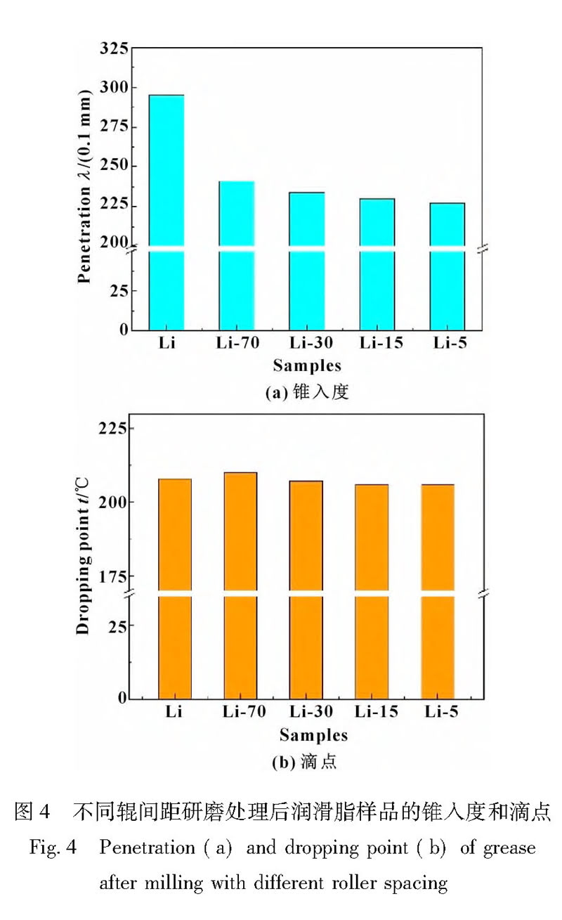 圖4 所示為分別采用不同輥間距研磨處理后潤(rùn)滑脂的錐入度和滴點(diǎn)變化曲線。從圖4 (a) 中可以看出,隨著研磨處理輥間距的變小,潤(rùn)滑脂的錐入度逐漸減小,即潤(rùn)滑脂逐漸變硬。研磨處理的輥間距逐漸減小,兩研磨輥之間的剪切作用力逐漸增強(qiáng),潤(rùn)滑脂中稠化劑的分散程度在較強(qiáng)剪切力的作用下逐漸提高[21],稠化劑的比表面積增大,因此和基礎(chǔ)油的相互作用增強(qiáng),潤(rùn)滑脂變硬,錐入度降低。從圖4 (b)中可以看出,潤(rùn)滑脂的滴點(diǎn)隨著研磨處理輥間距的減小無顯著變化,約為208 ℃。潤(rùn)滑脂的滴點(diǎn)主要取決于稠化劑的類型,所以滴點(diǎn)無顯著變化[22]。