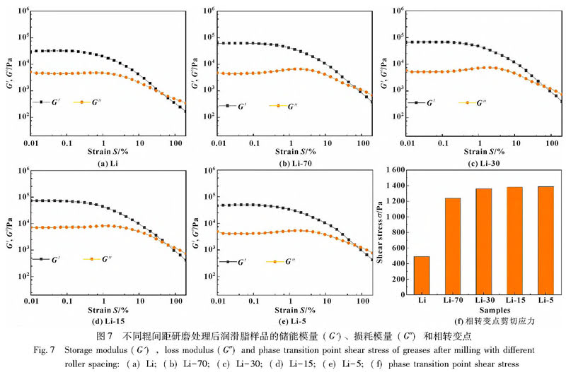 圖7 所示為鋰基潤(rùn)滑脂脂樣品的流變學(xué)性能測(cè)試結(jié)果。圖7 ( a) 、( b) 、( c) 、( d) 、( e) 所示為儲(chǔ)能模量( G') 和損耗模量( G″) 的曲線,可以看出,隨著剪切變形量的增加,儲(chǔ)能模量( G') 和損耗模量( G″) 在經(jīng)歷線性黏彈區(qū)后逐漸降低,在非線性黏彈區(qū)相交于一點(diǎn),表明潤(rùn)滑脂從半流體態(tài)轉(zhuǎn)變?yōu)榱黧w態(tài); 且在交點(diǎn)之前儲(chǔ)能模量( G') 始終大于損耗模量( G″) ,表明潤(rùn)滑脂以彈性為主。圖7 ( f) 是根據(jù)儲(chǔ)能模量和損耗模量曲線得到的相轉(zhuǎn)變點(diǎn)的剪切應(yīng)力柱狀圖,可以看出,隨著研磨輥間距的減小,鋰基潤(rùn)滑脂相轉(zhuǎn)變點(diǎn)的剪切應(yīng)力逐漸增大,即潤(rùn)滑脂的結(jié)構(gòu)強(qiáng)度逐漸增強(qiáng)。這是由于隨著研磨輥間距的減小,團(tuán)聚的稠化劑被打開和均勻分散,增大了稠化劑的比表面積,增強(qiáng)了稠化劑與基礎(chǔ)油的相互作用力,提升了潤(rùn)滑脂的結(jié)構(gòu)強(qiáng)度[24]。
