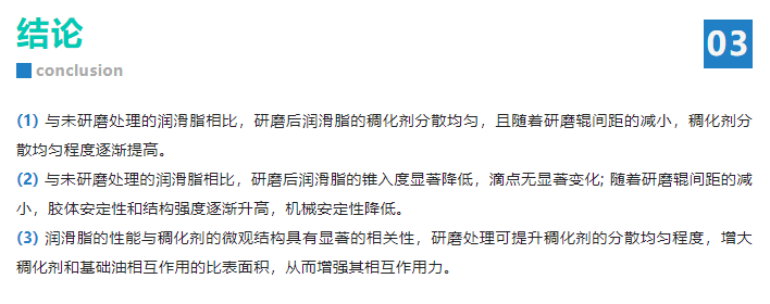 三輥研磨機(jī)是潤(rùn)滑脂均質(zhì)化的重要設(shè)備,隨著機(jī)電控制和磨輥技術(shù)的發(fā)展,三輥研磨機(jī)可實(shí)現(xiàn)輥間距在微米級(jí)別的精確調(diào)控。為明確三輥研磨機(jī)的輥間距對(duì)鋰基潤(rùn)滑脂微觀結(jié)構(gòu)和性能的影響,本文作者采用不同輥間距研磨處理了鋰基潤(rùn)滑脂,表征了樣品稠化劑的微觀結(jié)構(gòu),測(cè)試了樣品的錐入度、滴點(diǎn)、機(jī)械安定性、膠體安定性和流變性能,分析了微觀結(jié)構(gòu)與性能的關(guān)聯(lián)性。