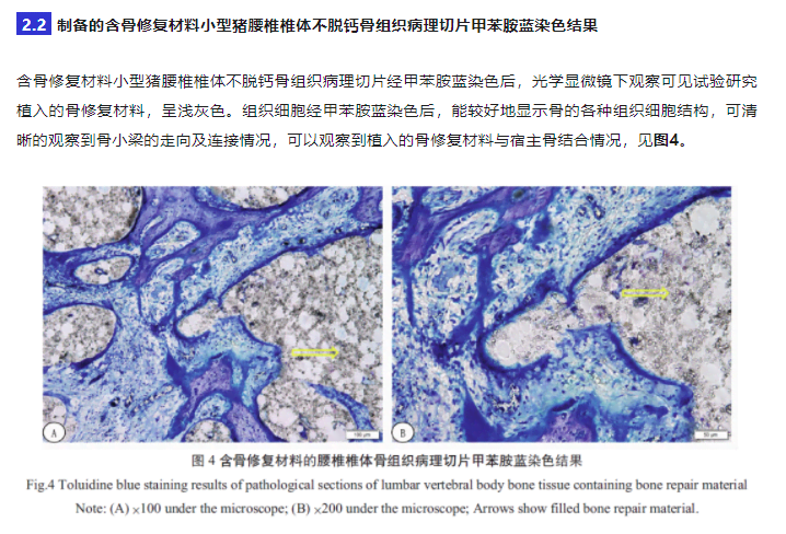 用于骨修復(fù)的生物材料及器械在進(jìn)行臨床試驗(yàn)前均需要進(jìn)行臨床前安全性和有效性動(dòng)物試驗(yàn)研究,以預(yù)測(cè)其應(yīng)用于臨床可能發(fā)生的不良作用[1,2]。骨修復(fù)材料的動(dòng)物試驗(yàn)研究需要制備合適的骨缺損動(dòng)物模型,將骨修復(fù)材料植入到制備的骨缺損區(qū)域,評(píng)價(jià)骨缺損部位的局部炎癥反應(yīng)、骨整合程度、骨重建情況,對(duì)該骨修復(fù)材料的安全性及有效性進(jìn)行評(píng)價(jià)[3,4]。生物材料及醫(yī)療器械動(dòng)物試驗(yàn)周期結(jié)束后,需要剖檢、取樣,切取連帶植入物及其周邊骨組織進(jìn)行病理組織切片制備,以觀察生物材料及醫(yī)療器械與宿主骨組織結(jié)合界面的結(jié)合情況及其在動(dòng)物體內(nèi)的吸收降解情況。與普通的石蠟包埋組織切片制備方法相比,埋置有植入物的骨組織標(biāo)本進(jìn)行組織切片制備時(shí)采用樹(shù)脂包埋病理組織切片制備方法不需要進(jìn)行脫鈣處理,不需要額外剔除組織內(nèi)埋置的植入物,可完整的觀察到植入物與宿主骨組織結(jié)合界面的組織反應(yīng)情況,實(shí)現(xiàn)對(duì)植入物與骨組織結(jié)合界面組織細(xì)胞學(xué)變化的研究。本研究對(duì)植入了骨修復(fù)材料小型豬腰椎椎體不脫鈣病理組織切片制備方法進(jìn)行了研究,以期能為相關(guān)研究人員提供參考。