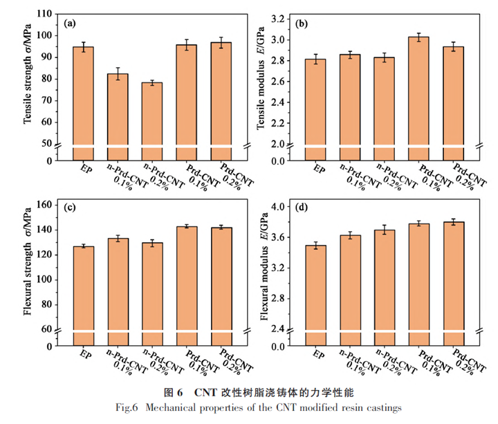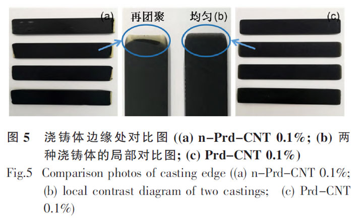 2.3 CNT改性樹脂澆鑄體的力學(xué)性能CNT改性樹脂澆鑄體試樣邊緣處對(duì)比如圖5所示,對(duì)于質(zhì)量分?jǐn)?shù)為0.1%的n-Prd-CNT 改性樹脂澆鑄體(圖5(a)),在邊緣處可以明顯看到CNT向內(nèi)部團(tuán)聚,能夠直接觀察到邊緣區(qū)域的CNT 分布不均勻。對(duì)于相同含量的Prd-CNT 改性樹脂澆鑄體(圖5(c)),邊緣處的顏色均勻。CNT改性樹脂澆鑄體固化時(shí),在樹脂凝膠前,溫度的提高會(huì)使CNT受熱運(yùn)動(dòng)發(fā)生再團(tuán)聚以及沉降。而預(yù)分散處理有效地改善了CNT在樹脂中的分散性,提高了CNT在樹脂升溫固化階段的穩(wěn)定性。
