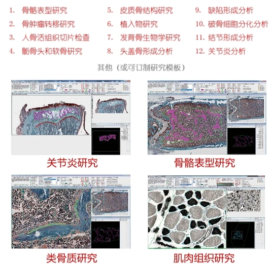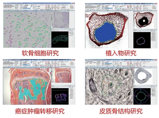 使用OM骨形態(tài)計(jì)量系統(tǒng)BQ骨生物學(xué)計(jì)量研究系統(tǒng),通過內(nèi)置計(jì)量學(xué)公式和分析模板進(jìn)行骨組織形態(tài)計(jì)量分析。廣泛應(yīng)用于解剖學(xué)、病理學(xué)、骨科學(xué)、口腔醫(yī)學(xué)、心腦血管、藥學(xué)、組織工程學(xué)、轉(zhuǎn)化醫(yī)學(xué)等基礎(chǔ)研究、臨床診斷、植介入材料與器械的生物相容性評(píng)價(jià)、法醫(yī)學(xué)、古生物學(xué)和古化石研究、脊椎類海洋生物研究等所有領(lǐng)域。可進(jìn)行定性/定量研究,包括基礎(chǔ)研究和臨床研究中所有的動(dòng)態(tài)指標(biāo)和靜態(tài)指標(biāo)都可直接計(jì)量獲取并分析。